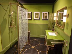 На втором фото (справа) — смелая зелёная ванная зона.