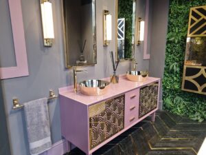 На первом фото (слева) представлена яркая композиция: туалетный столик в нежно-розовом цвете с акцентом на золотые раковины-чаши и декоративные дверцы с орнаментом в стиле ар-деко.