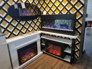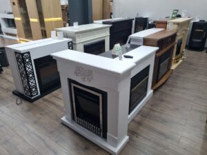 Фотография справа демонстрирует современную линейку настенных и встроенных электрокаминов. На стенде показаны: