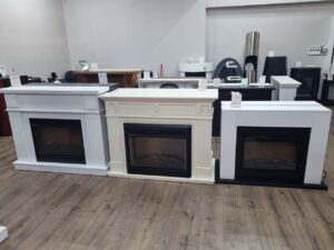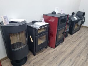 На фотографии представлена линейка дровяных печей, выполненных в современном европейском стиле.