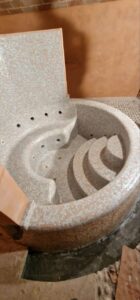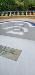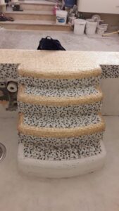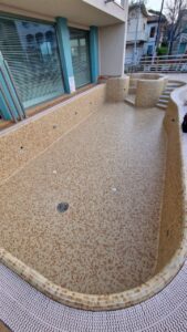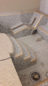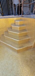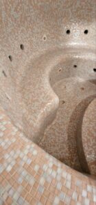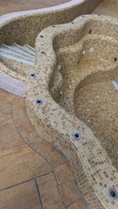Мозаика, представленная на фото, состоит из нескольких частей и формирует эффектные композиции, плавно повторяя изгибы чаши бассейна и создавая ощущение цельной поверхности. Отделка возможна в широком спектре оттенков — от мягких бежевых и перламутровых тонов до изысканного «золотого» эффекта, придающего интерьеру статус и утончённость.
